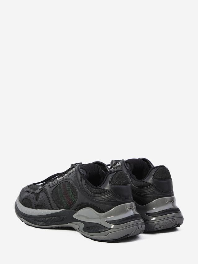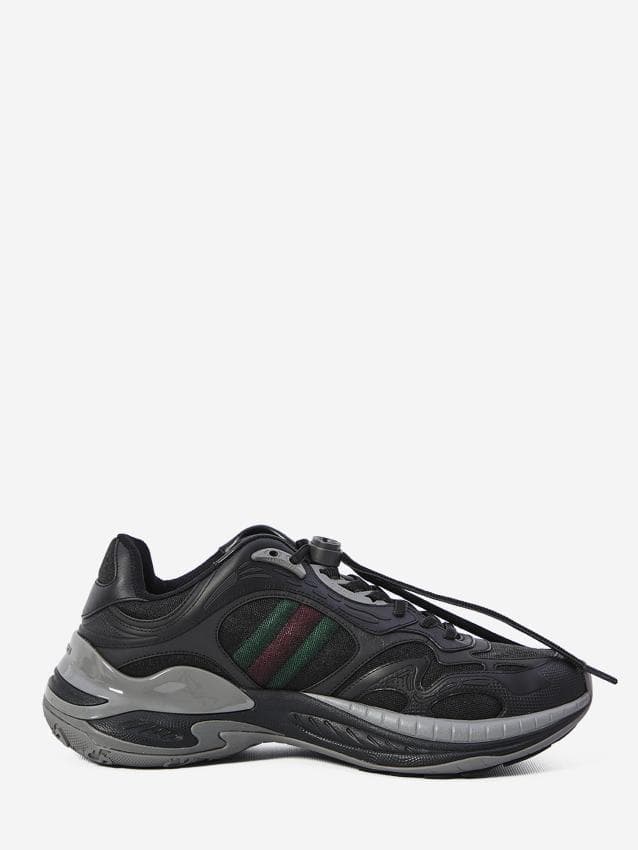 Gucci 2.0 sneakers in black mesh and leather. They feature a round toe, drawstring lace-up closure with GG Interlocking toggle, grey reflex material insert with GG finishes, padded Web ribbon detail on the sides, GG detail on the eyelets, embossed Gucci logo on the heel, branded insole, and rubber outsole. Dust bag included. Additional laces included. Any imperfections in the leather are not to be considered manufacturing defects but rather a characteristic of the material.