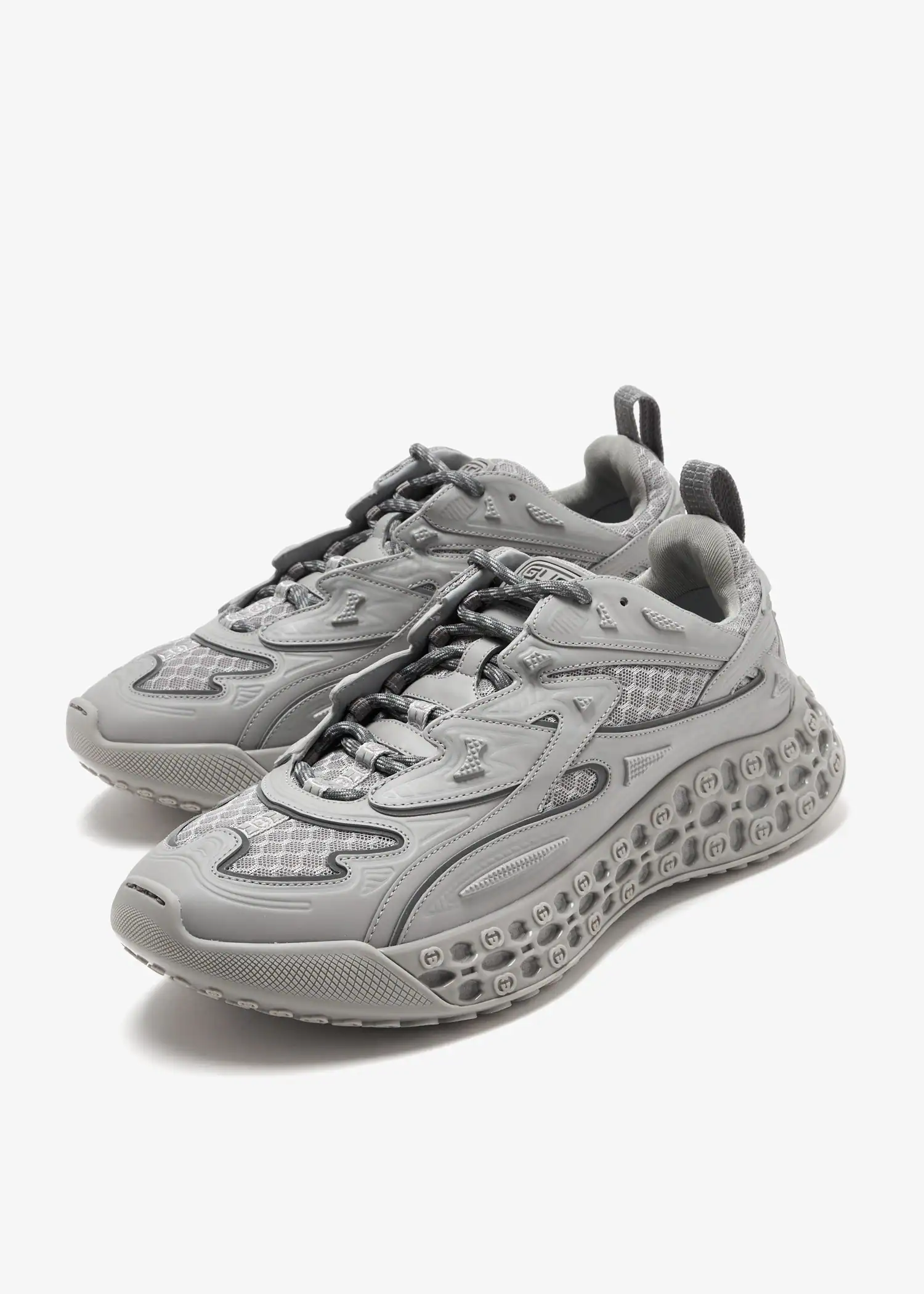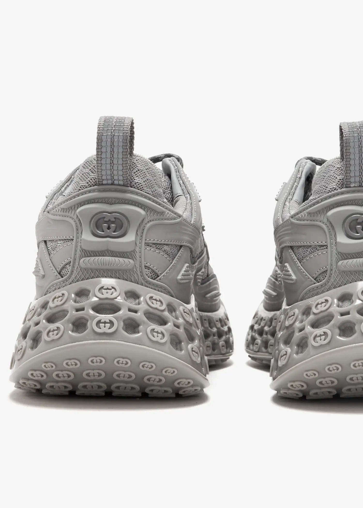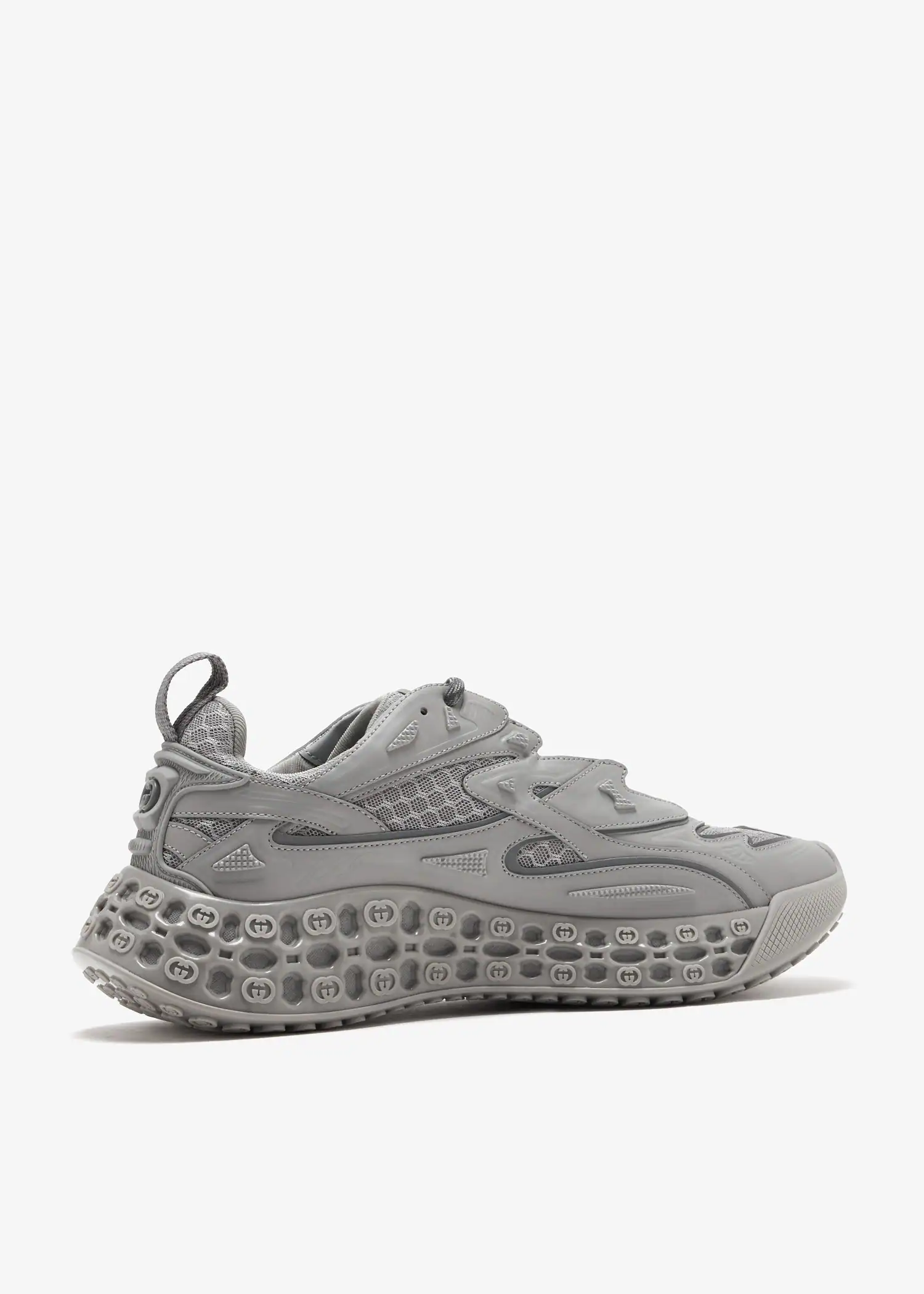 Sustainability, innovation, and heritage craftsmanship merge in the Cub3d trainer by Gucci. Featuring an upper made from mesh and Demetra—an innovative material crafted from at least 70% vegetable raw materials, including viscose, wood pulp, and bio-based polyurethane—this new-age sneaker is defined by its bi-material sole, embossed with an interlocking G pattern and a striking 3D effect.