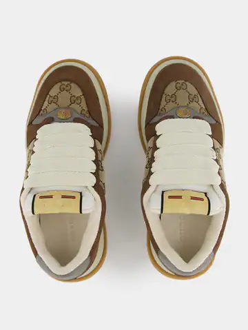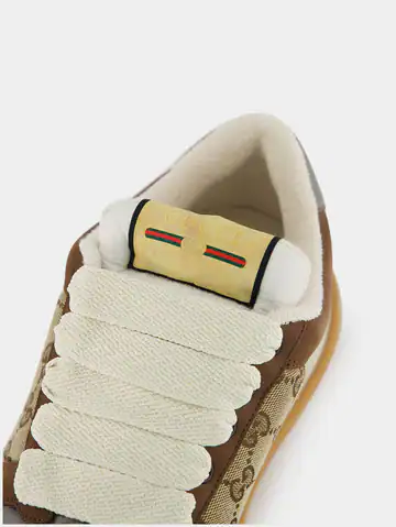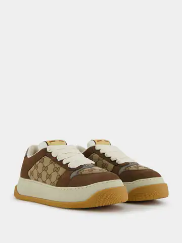 Screener GG Supreme Sneakers. Crafted from the iconic GG Supreme canvas, these sneakers feature exquisite suede trim that adds a touch of sophistication. The signature Double G logo takes center stage, while the round toe and front lace-up fastening ensure both comfort and style. A logo patch at the tongue, branded heel counter, and insole showcase attention to detail. Finished with a flat rubber sole, these sneakers are a perfect blend of fashion and functionality.