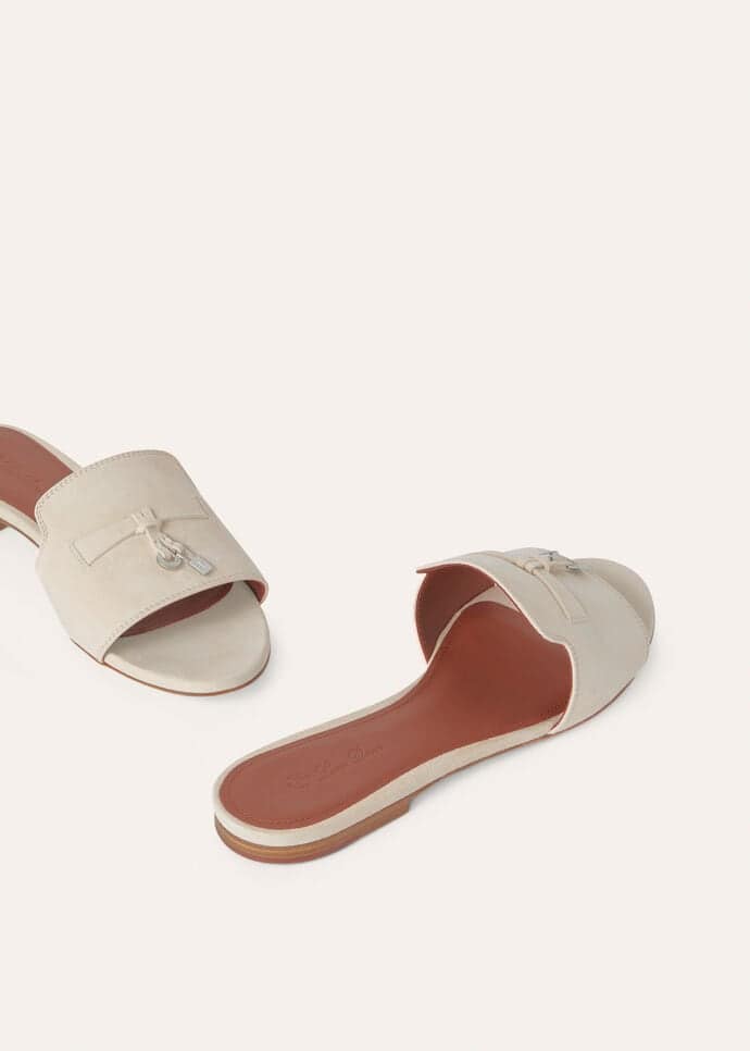 Suede sandal accessorised with a band featuring Loro Piana’s My Charms, edged with tonal stitching. Refined, feminine footwear, perfect both in the city and on holiday