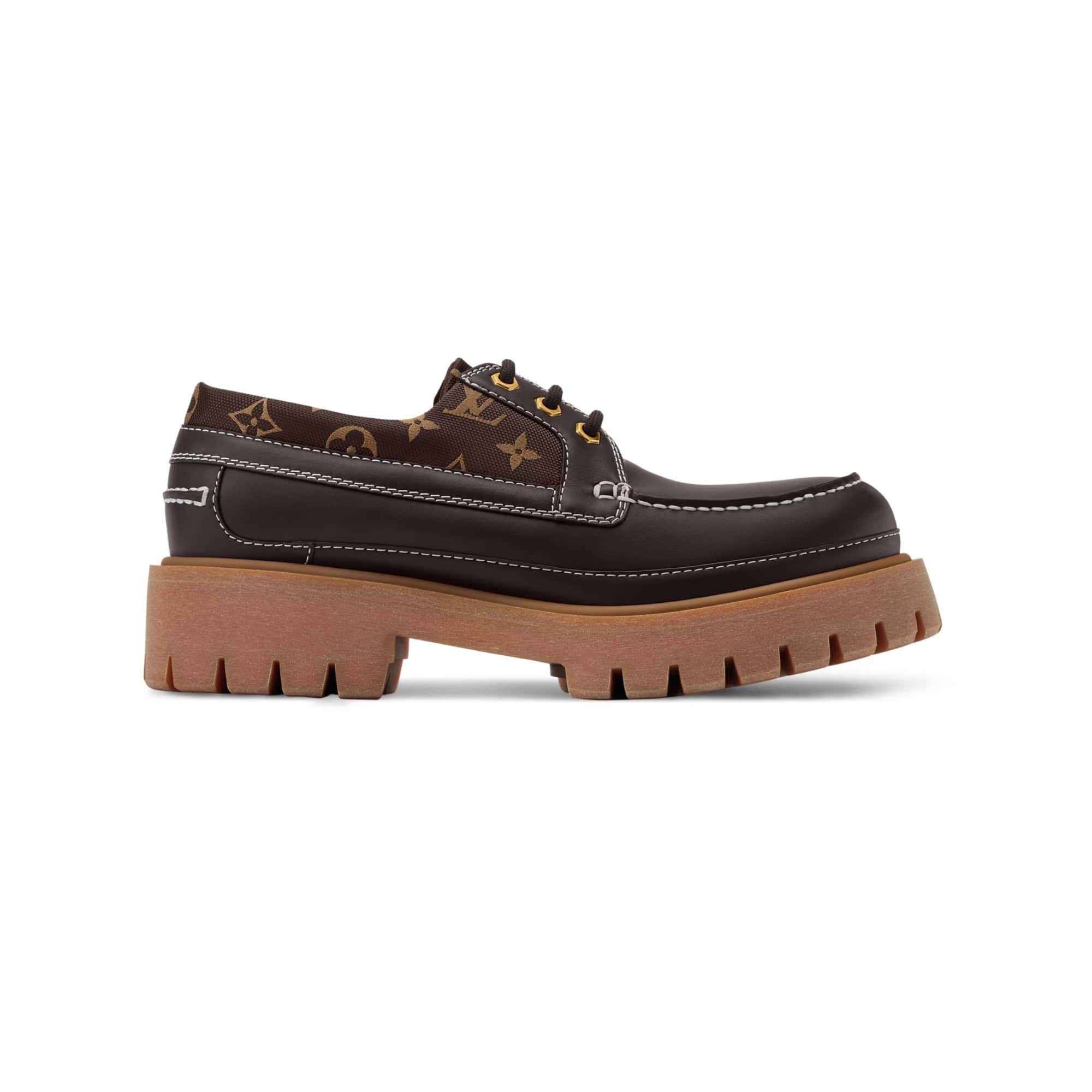 The LV Remix boat shoe is an on-trend, utilitarian style combining smooth calf leather with Monogram jacquard canvas. The upper is complemented by refined details, in particular white stitching, which creates a subtle vintage feel. The chunky outsole is made of extremely lightweight rubber and features House signatures on the tread.