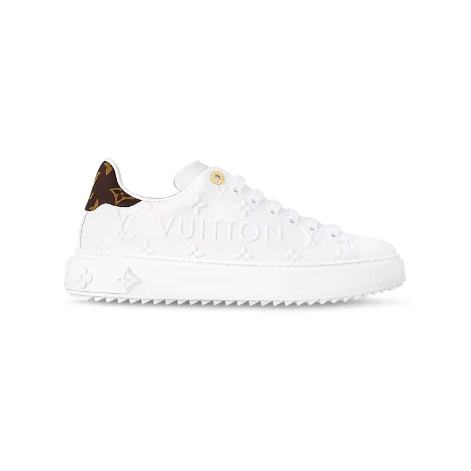 The emblematic Time Out sneaker is revisited in soft calf leather, which is debossed with the Louis Vuitton signature and the Monogram pattern. The design is complemented by a trim in recycled Monogram nylon at the back. This model is finished with an elevated rubber outsole with a 3-D pattern of Monogram Flowers.