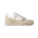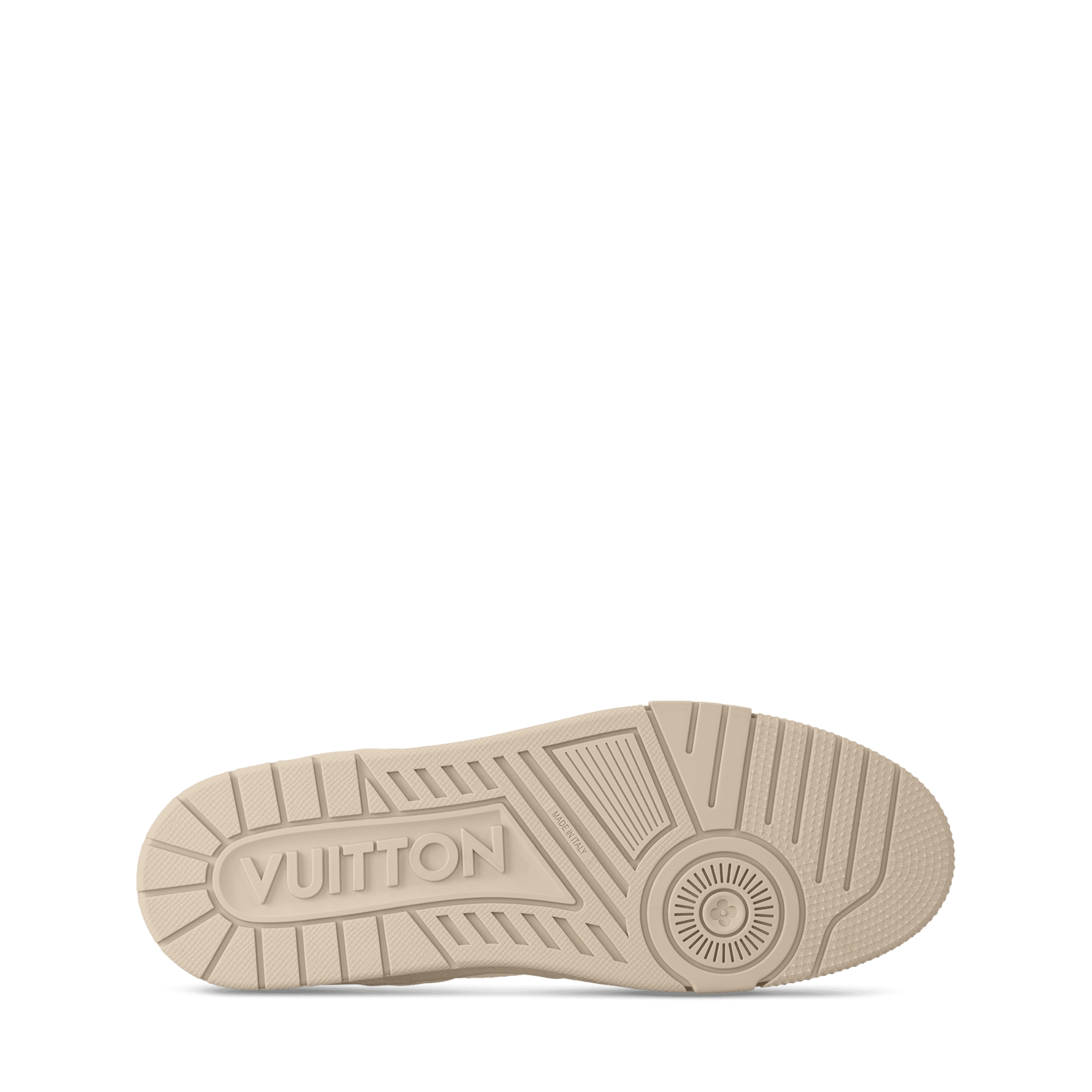The iconic LV Trainer sneaker is revisited this season in a striking two-tone version in grained nubuck leather and mesh. The contrast of colors and materials highlights the elaborately constructed upper of this model, which was inspired by vintage basketball sneakers. It is complemented by rubber LV Initials and Vuitton signatures.