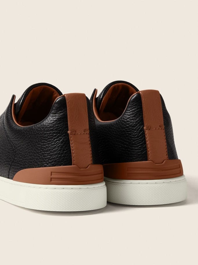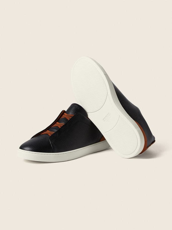 The Nero Oasi deerskin Triple Stitch™ sneakers are mounted on a white rubber sole for a sleek look. The Brand’s signature triple-crossed elastic detail ensures an easy slip-on fit, while evoking the traditional hand-stitching of tailored jackets to symbolize and honor ZEGNA’s legacy of fine craftsmanship. Foliage-colored leather lining and the ZEGNA 232 Road Brand Mark complete the design.
