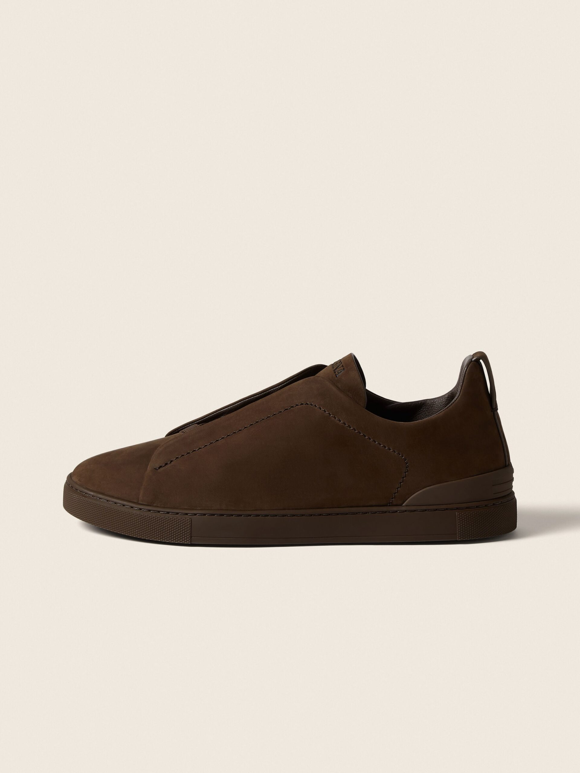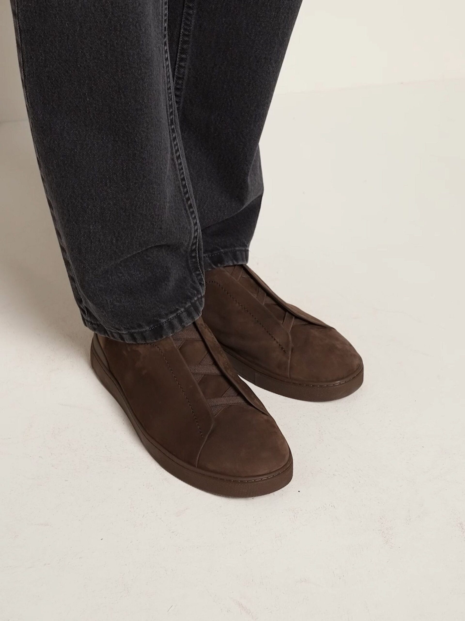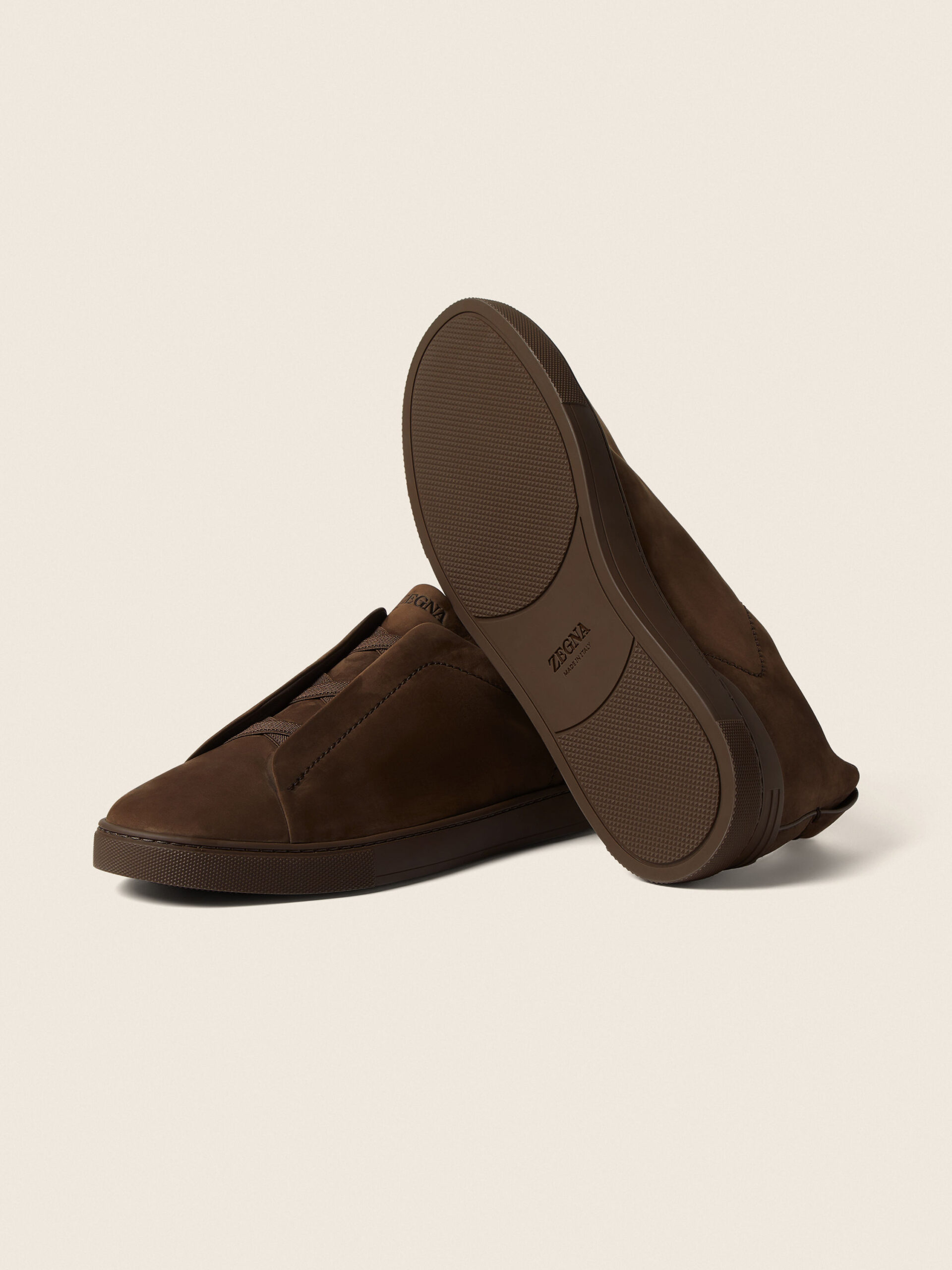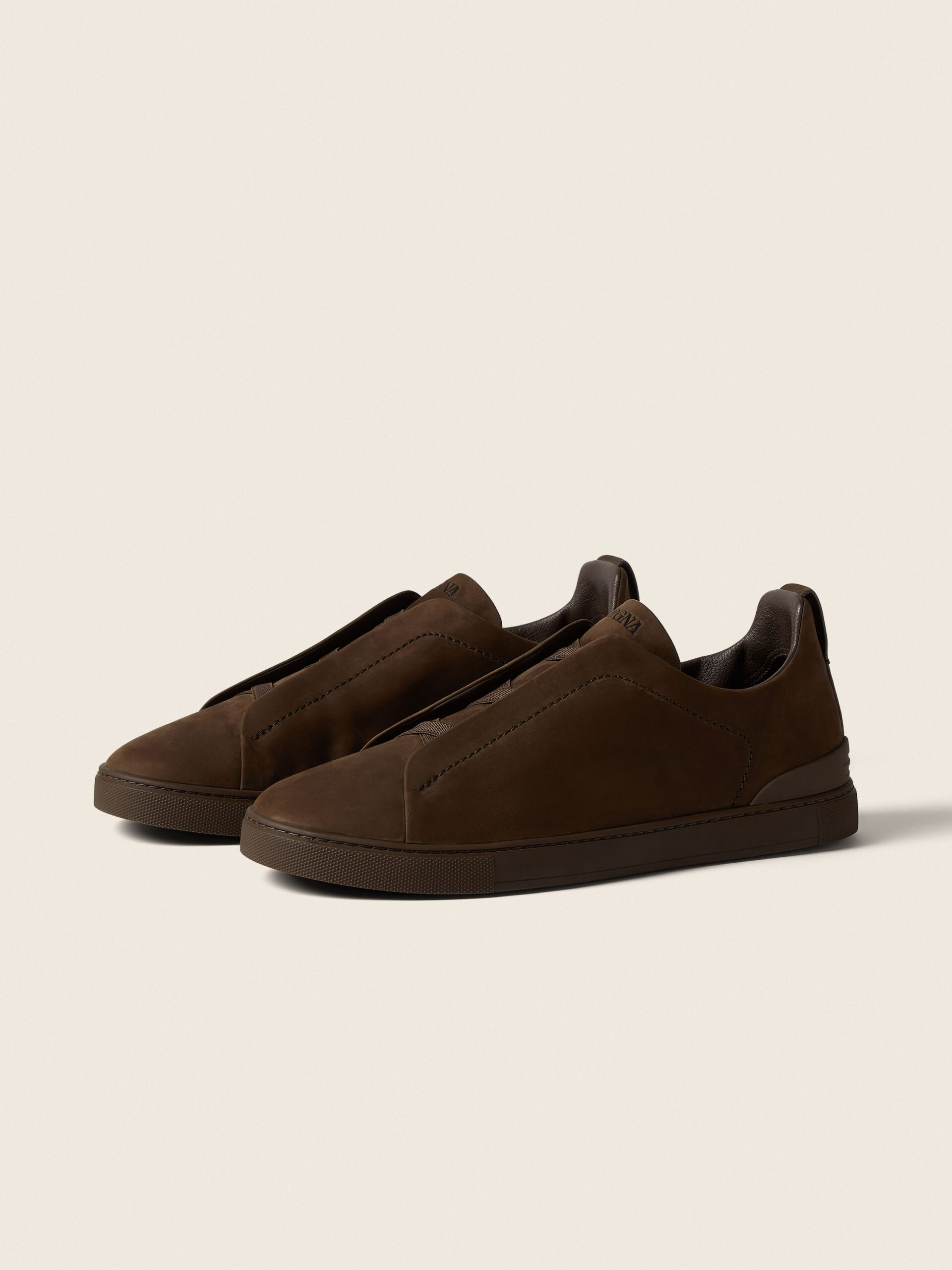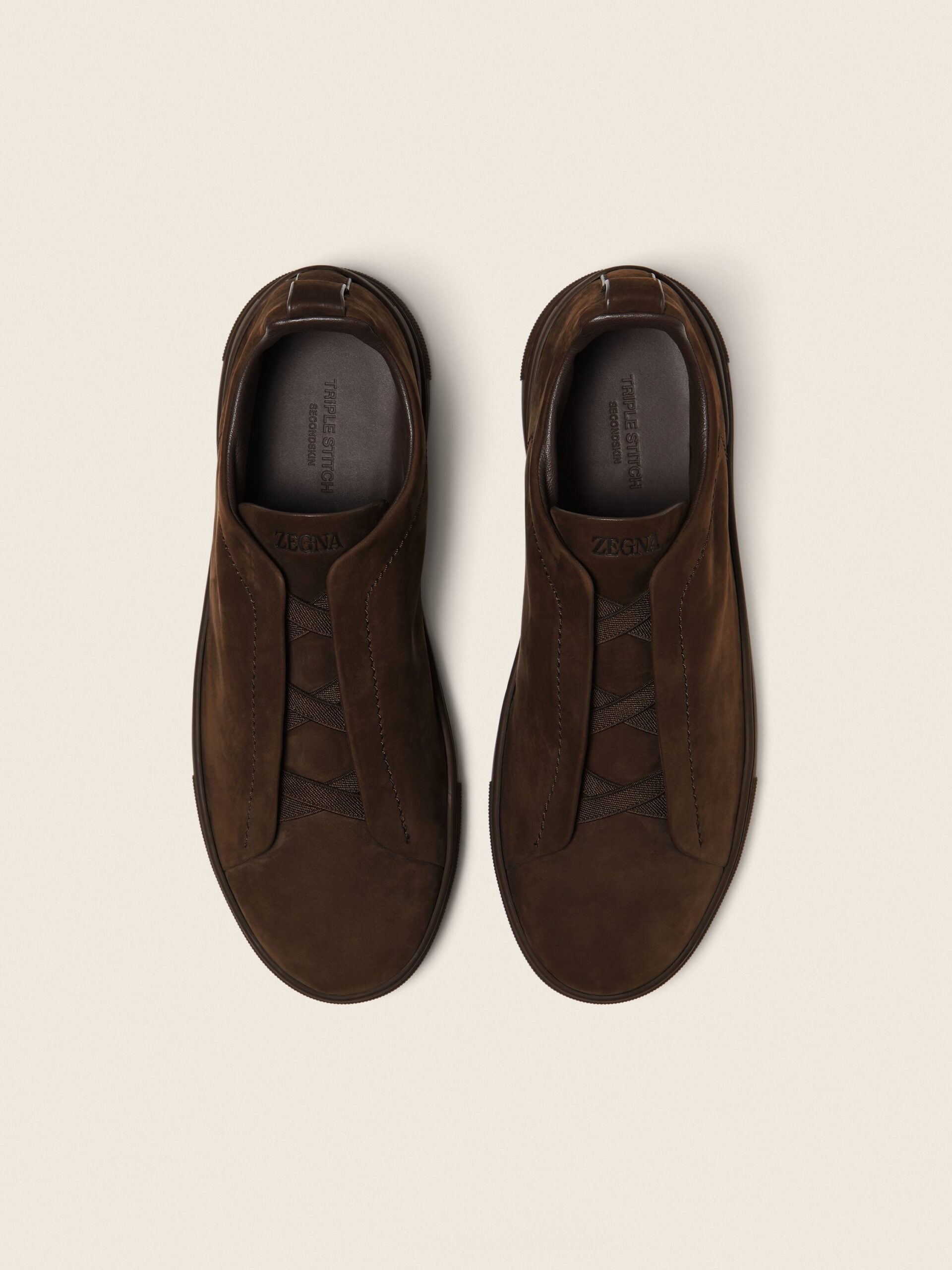 These Triple Stitch™ SECONDSKIN sneakers are crafted from ZEGNA’s exclusive nubuck for a glove-like fit. Presented in dark brown with a tonal rubber sole, they feature our hallmark style’s characteristic crossed elastics that evoke the traditional hand-stitching of tailored jackets in homage to the Brand’s legacy of fine craftsmanship. The ZEGNA 232 Road Brand Mark on the heel tab signs off the design.