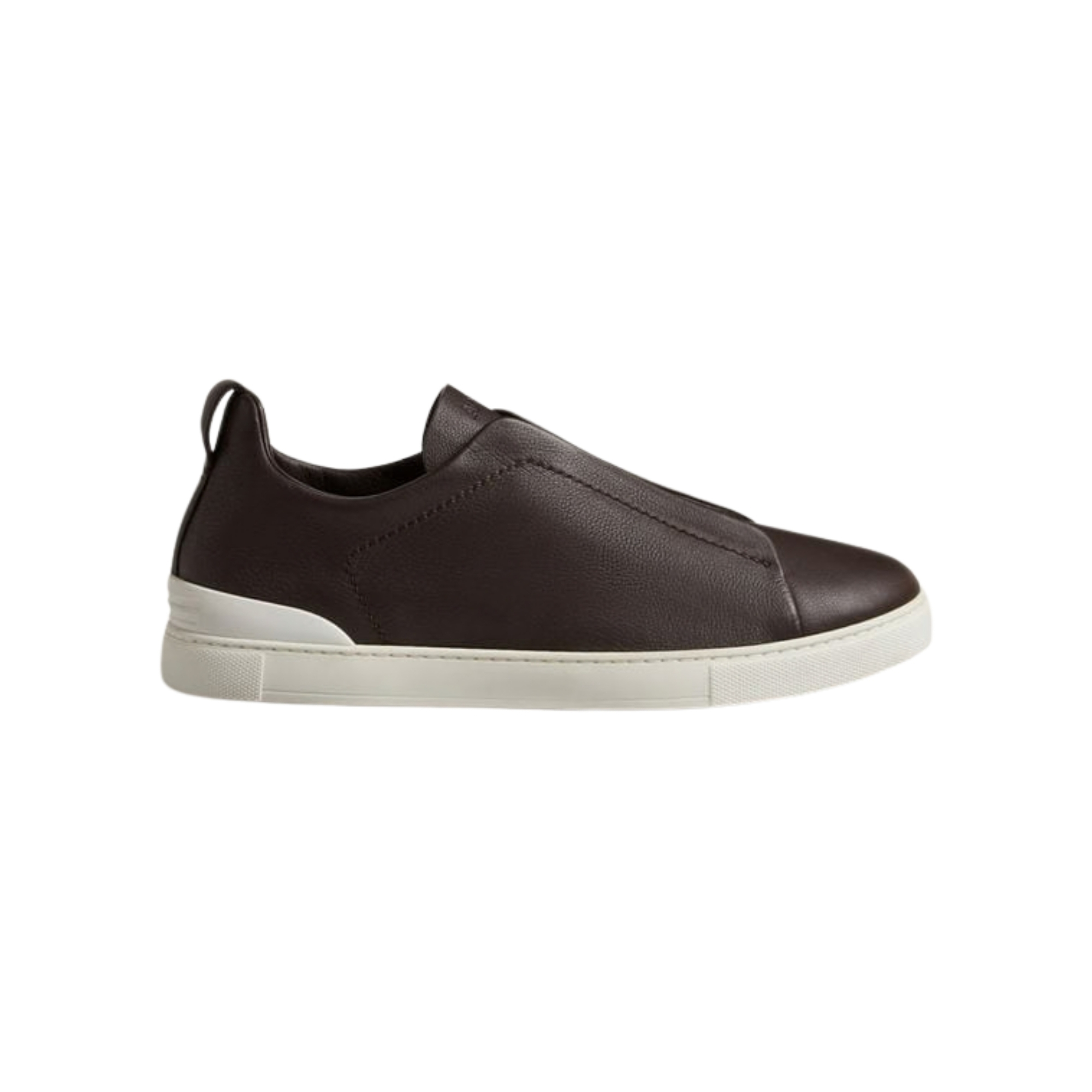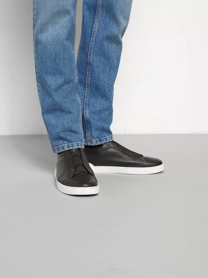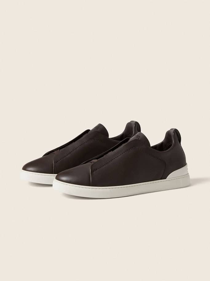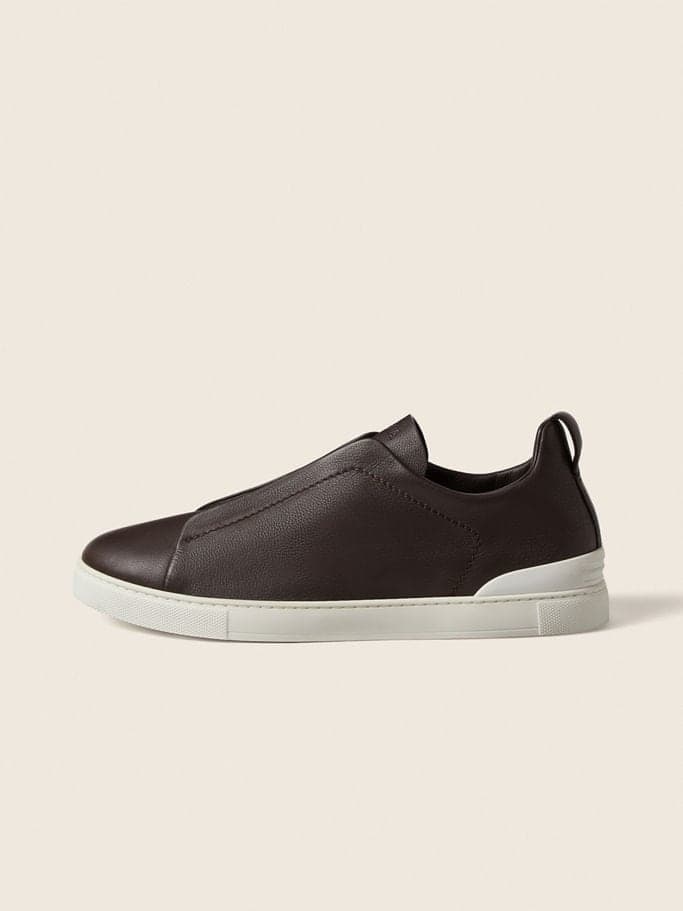 The dark brown Triple Stitch™ SECONDSKIN sneakers are crafted from specially selected leather for even more flexibility. The Brand’s signature triple-crossed elastic detail ensures an easy slip-on fit, while evoking the traditional hand-stitching of tailored jackets to symbolize and honor ZEGNA’s legacy of fine craftsmanship. The super soft, light uppers are complemented by a white rubber sole.
