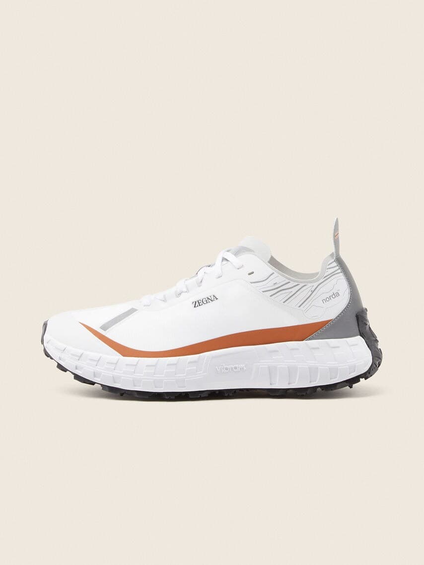 Italian style meets precision running technology: the ZEGNA x norda™ 001 white technical fabric sneakers are designed for maximum performance. The running sneakers feature uppers made from Dyneema®, the world’s strongest fiber™, mounted on super lightweight Vibram® soles. Foliage-colored details and both brands’ logos sign off the look.